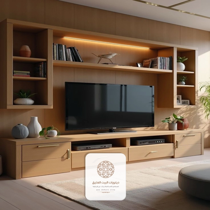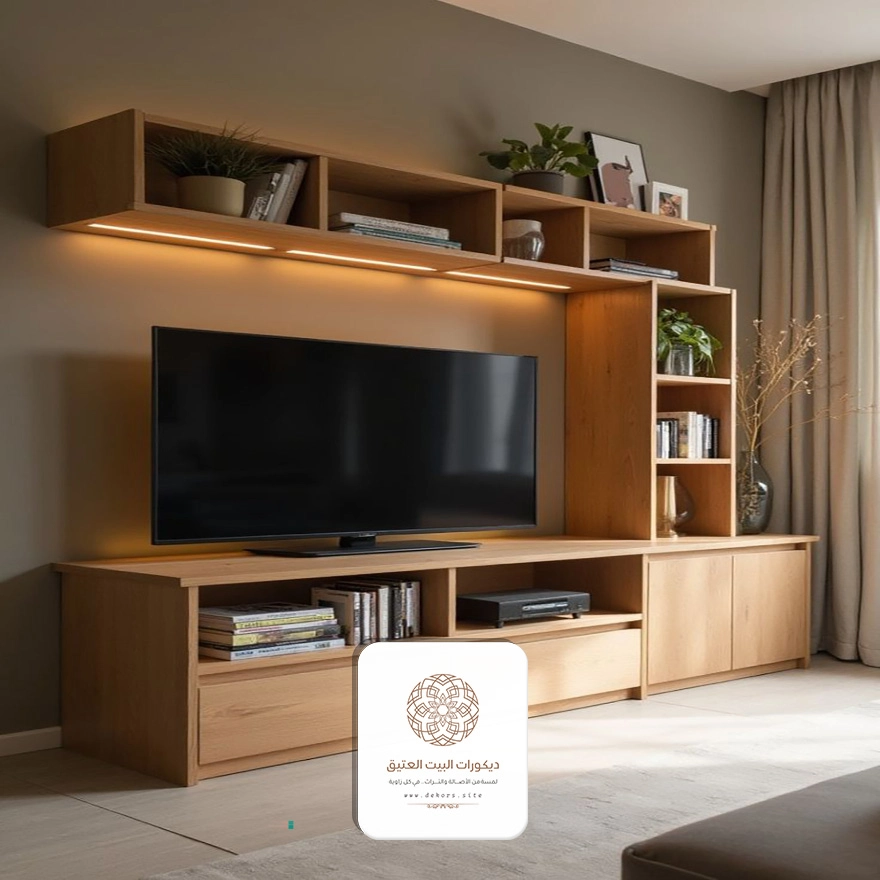 رفوف خشب للتلفزيون ، خاصة ان منطقة التلفزيون هي نقطة الارتكاز الدائم في أي مكان ، و لإضافة لمسة فاخرة على الرفوف الموجودة حول التلفاز فإننا نقوم بإضافة إضاءة متميزة ، تبرز جمال الخشب و تضيف إضاءة محيطة هادئة ، و تعد هذه الرفوف العنصر التكميلي لديكور التلفزيون ، فهي تعمل توازن أكثر من رائع للديكور .