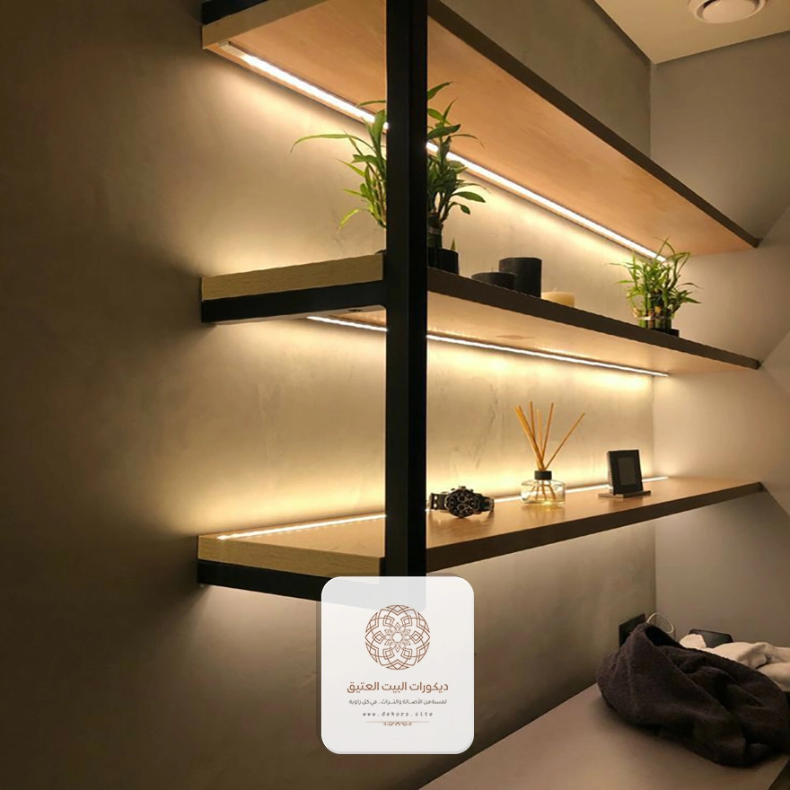 - أيضا أضف شريط إضاءة LED مخفي تحت الرفوف الزاوية لتسليط الضوء على المعروضات وجعل الزاوية أكثر إشراقًا وجاذبية .